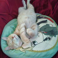 Once he was home, Daxter quickly picked Jaimee’s brother-in-law as his favorite human, and happily settled into his part of the house. He and Miwa got used to each other’s scents from opposite sides of a closed door before being introduced to each other. His favorite game is to sneak up on Miwa, then strike a dramatic “Halloween pose” (arched back, puffed tail) and run away when she notices him. When he’s not being a typical annoying little brother, he’s usually curled up on someone’s lap or in a pile of soft blankets.